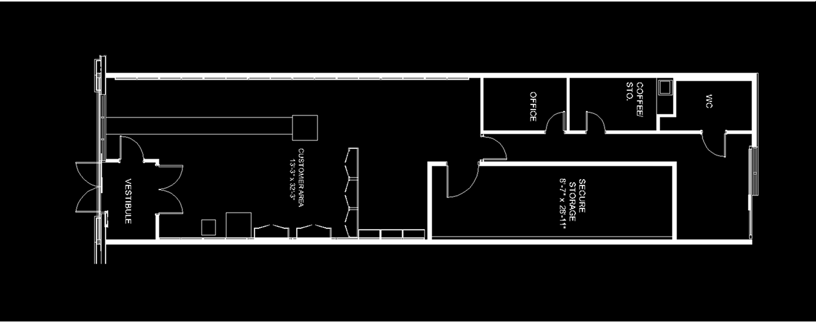 access to support inventory control and regulatory compliance, as well as a dedicated staff office for administrative and operational needs. The furniture layout supports smooth store operations, with the point-of- sale counter strategically positioned for efficient checkout and customer interaction, and display shelving thoughtfully arranged to maintain a clean, organized aesthetic. Discreet yet effective security integration is incorporated throughout the space to ensure a safe, controlled, and professional retail environment.